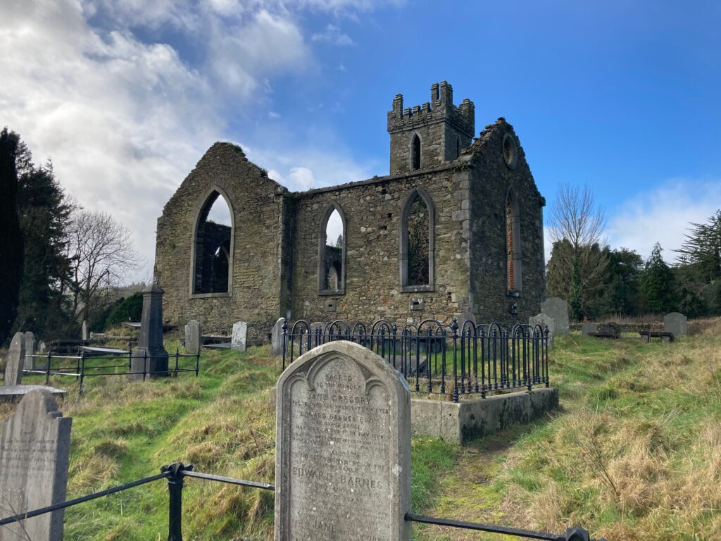 Georgian stone. Tall, empty lancets. Gravestones from the 1760s leaning into Wicklow grass.